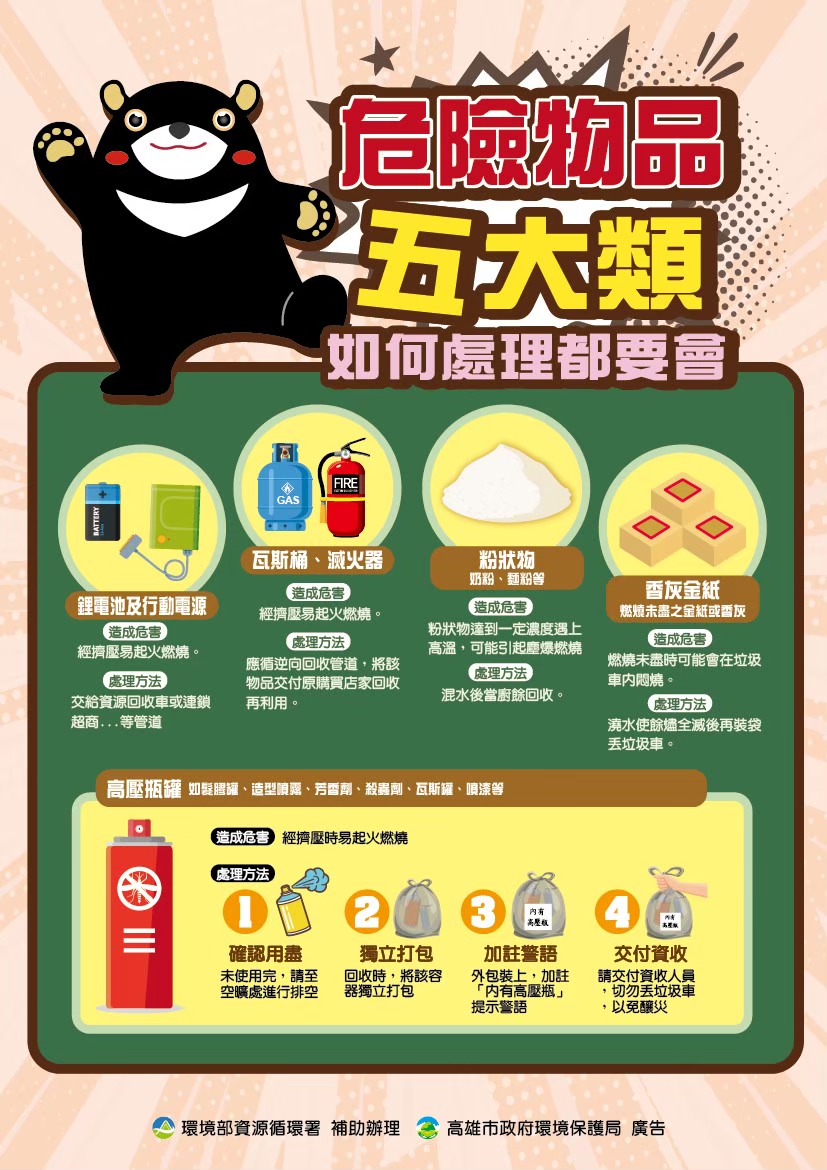 環保局提醒,為確保清運安全,請市民務必正確分類並妥善處理五大危險物品,切勿直接丟入垃圾車:①高壓瓶罐(髮膠噴霧、殺蟲劑、瓦斯罐、打火機等)請先排空,交由資源回收車回收、②食用性粉狀物(奶粉、麵粉等)請加水後交付廚餘回收、③香灰及未燃盡金紙,請澆水後裝袋,交由垃圾車清運、④鋰電池、行動電源:請單獨分開,交資源回收車或連鎖便利商店回收、⑤滅火器、瓦斯桶,請交由原購買店家回收再利用。