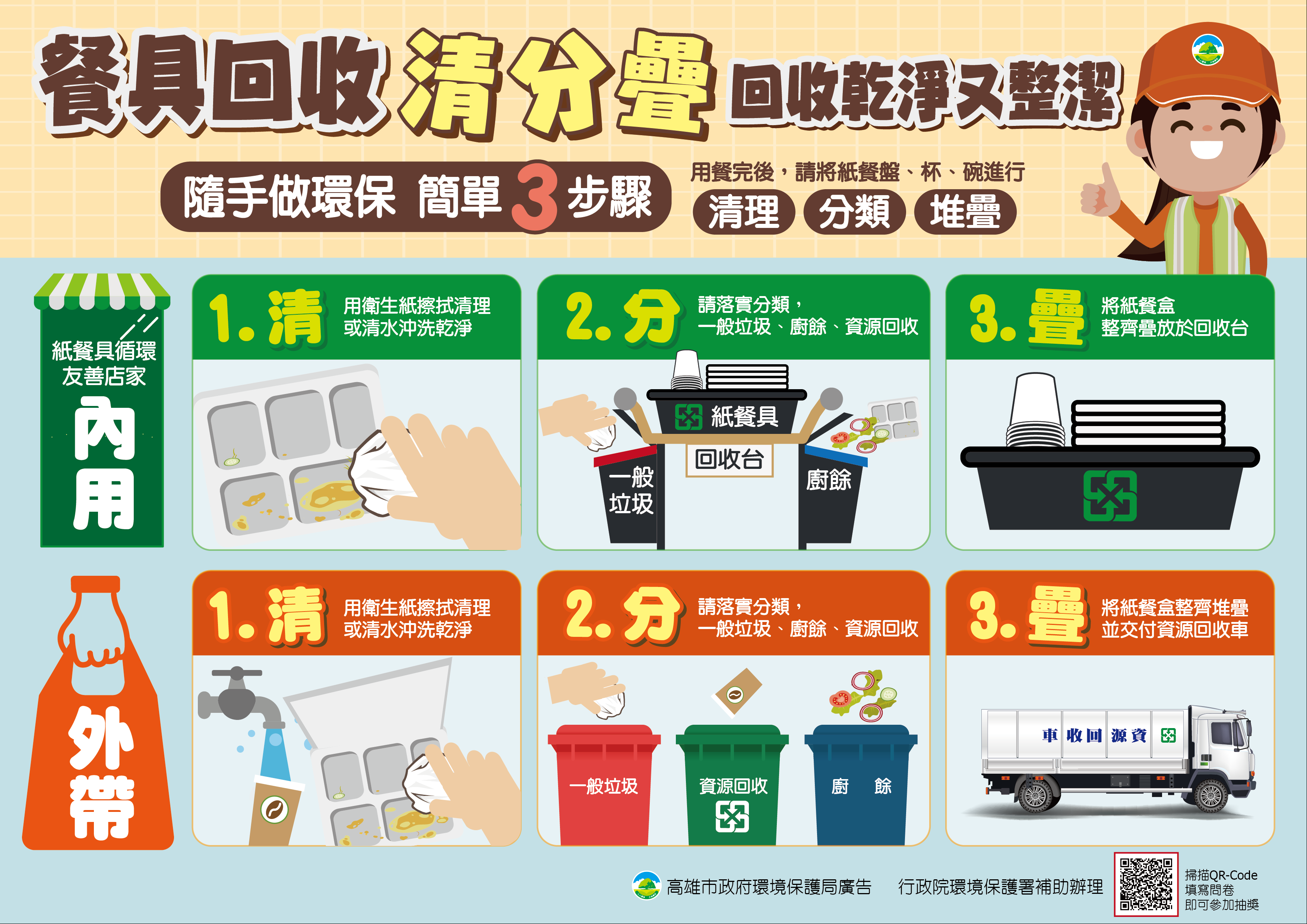 本局近年針對集合式社區大樓及垃圾車收運點沿線排出的垃圾包進行破袋稽查發現,有集合式社區大樓因後端回收業者不收,而張貼紙餐具不回收的錯誤訊息公告,誤導社區民眾將使用過後的紙餐具未加以清理就直接當垃圾丟棄,不僅造成第一線清潔人員工作負荷,也增加環境衛生問題。因此本局為加強對民眾宣導紙餐具回收之觀念,首創與高雄在地連鎖便當店業者𡘙師傅合作,在3萬個紙餐盒上印製「餐具回收清分疊 回收乾淨又整潔」宣導標語,藉以宣導民眾在店內、住家或辦公場所,均應將食用完的紙餐盒依據下述步驟進行回收處理,步驟1:剩餘食物殘渣倒入廚餘回收桶、步驟2:將可回收的資源物簡單沖洗或擦拭乾淨、步驟3:進行分類回收堆疊,最後再將免洗筷、衛生紙等一般垃圾投入一般垃圾桶內。紙容器的原料是食品用紙,並以臘或PE(聚乙烯)淋膜,以達到防水、防油的功能。而在回收上,PE可以再製成塑膠粒,用途非常廣泛,產品五花八門;而紙的部分,由於食品用紙是品質最高的紙質,回收後可再製成一般紙、紙箱或衛生紙等。