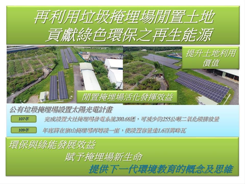環保局表示,配合環保署推動公有垃圾掩埋場設置太陽光電計畫,於105年底著手評估規劃高雄市已封閉或復育完成之垃圾掩埋場設置無汙染的再生能源太陽光電發電系統,並擇定大社一期垃圾衛生掩埋場及旗山區域性垃圾衛生掩埋場之部分閒置土地範圍進行標租設置,其中大社一期垃圾衛生掩埋場已於107年11月建置完成;另旗山區域性垃圾衛生掩埋場於本(10)月完成封閉復育工程驗收,將持續進場建置太陽光電發電系統。