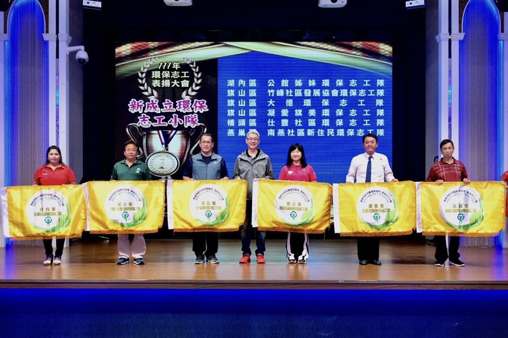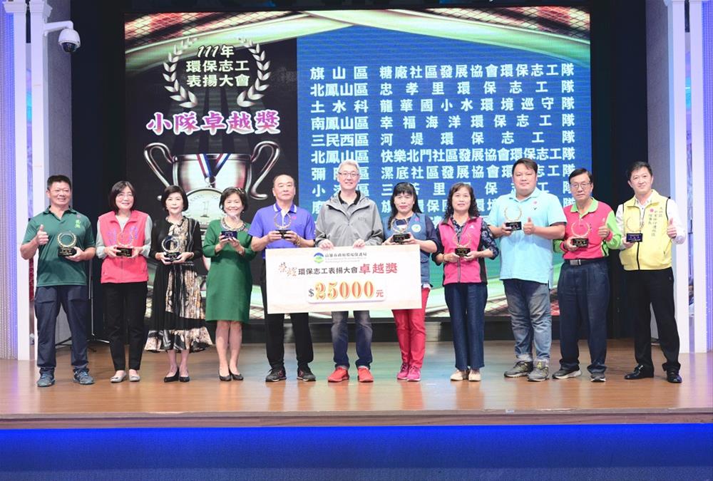此次志工小隊共有10隊獲卓越獎,旗山區「糖廠社區發展協會環保志工隊」已連續兩年榮獲本局志工小隊卓越獎外,並榮獲環保署「環保小學堂計畫」、「第8屆國家環境教育獎」特優獎殊榮,社區不僅推廣在地特色,也是環境保護、環境教育課程的熱門景點;「龍華國小水環境巡守志工隊」是由學校師生與熱心家長所組成,配合學校組織運作,肩負『從愛河出發,紮根於校園,落實於社區』的教育任務,對於環境保護推動持續貢獻心力,並曾協助校園深耕計畫並不定期舉辦淨溪及檢測等活動;另外,小港區「三苓里環保志工隊」對登革熱孳生源環境清理的貢獻良多,更因應疫情宣導民眾口罩如何正確消毒重複使用及丟棄方式,將環境資源再利用落實生活中。