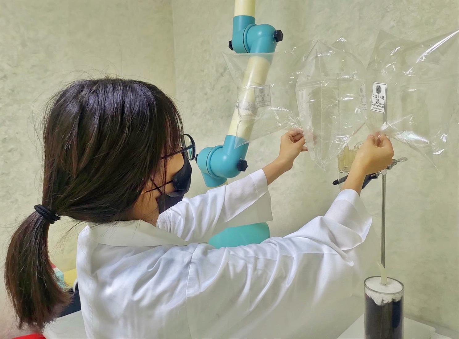 異味陳情多發生在夜間,空氣異味是否超標,從採樣到完成判定,依檢測標的不同,須在6或12小時內完成。異味樣品經採集後,再由6名嗅覺判定員進行官能測定,於「異味污染物官能測定室」環境下,逐一以乾淨空氣稀釋之嗅袋進行異味判定,檢測值再經公式運算嗅覺判定員全體閾值(對數值),再換算成異味污染物濃度值。
