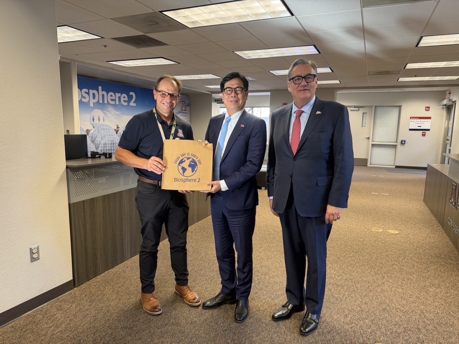 高雄市長陳其邁近日率團訪問美國,除進行一系列半導體與經貿交流行程外,並前往位於亞利桑那州的全球知名封閉式生態系統研究設施「Biosphere 2(生物圈2號)」參訪,在亞利桑那大學副校長Tomás Díaz de la Rubia、設施主要負責人John Adams的介紹下,訪團不只借鏡其在生態研究與環境教育經驗,作為高雄推動城市生物多樣性、生態教育與觀光的重要參考,更充分了解到氣候變遷的情境下,二氧化碳濃度、氣溫等對於生態系統的重大影響。