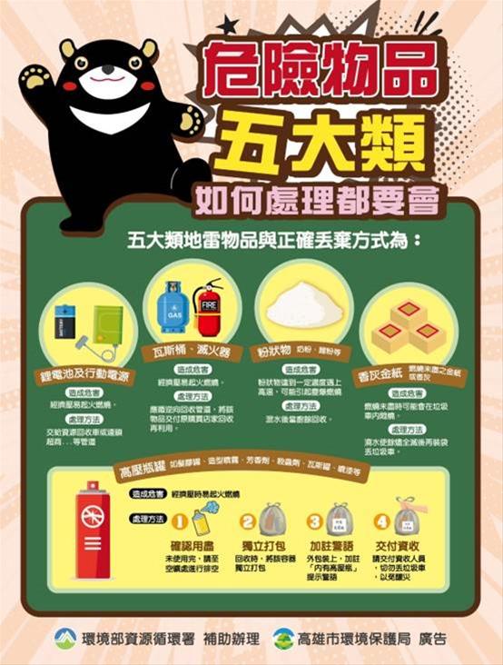 環保局表示,自從1月24日南區焚化廠發生火警,除加強清潔隊員隨時提高警覺,注意環保車輛狀況外,仍一再呼籲市民朋友落實資源回收分類,尤其高壓瓶罐、食用性粉狀物、金紙香灰餘燼、鋰電池及行動電源、滅火器及瓦斯桶等5大類危險物品,倘隨意丟入垃圾車,經擠壓產生之火花可能導致氣爆燃燒,將造成民眾、清潔隊員受傷,垃圾車或焚化廠損壞,不可不慎。