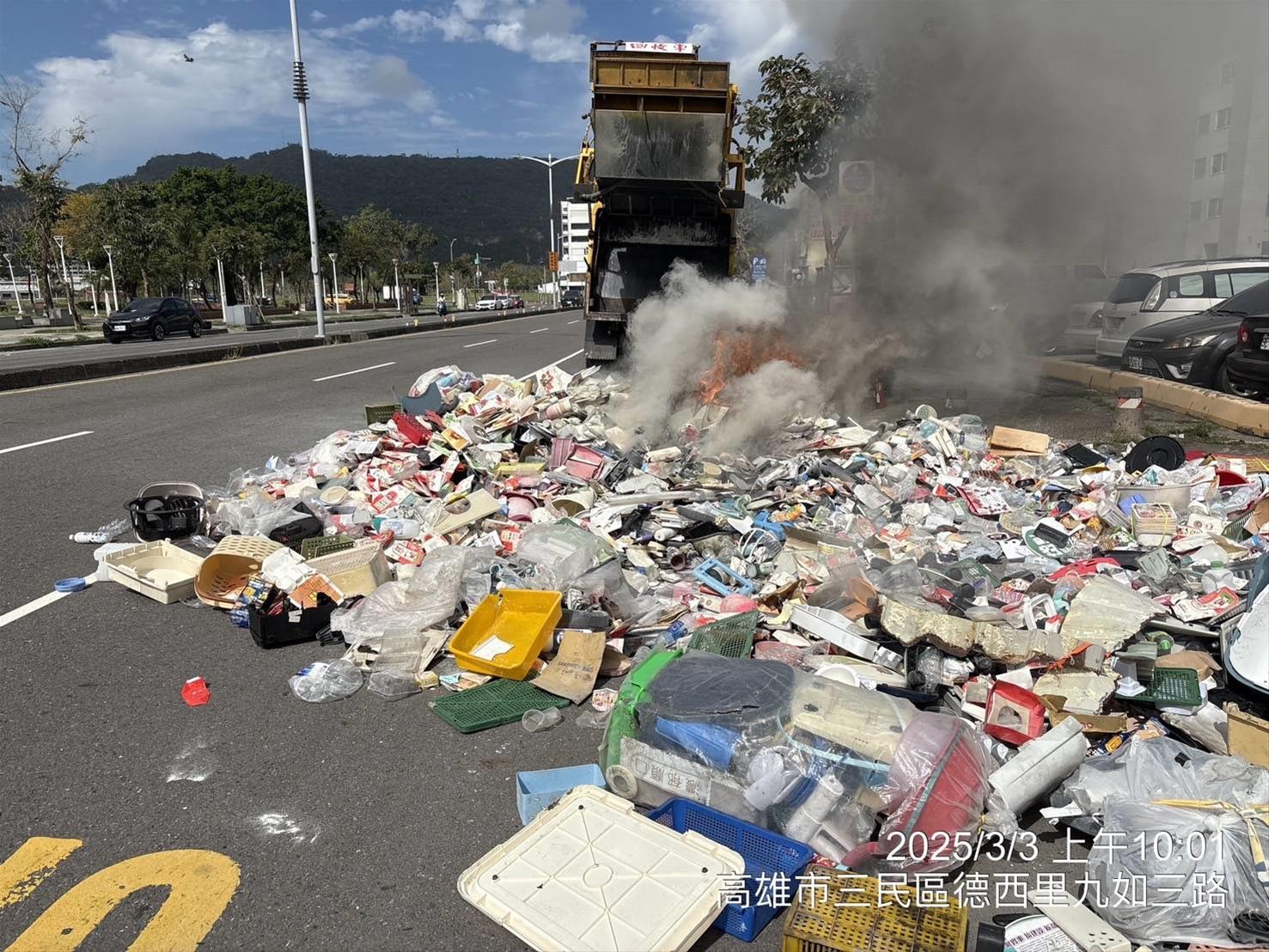今(3/3)日環保局清潔隊清運資源回收物車輛,車斗內突然冒出陣陣濃煙,清潔隊員趕緊把回收物倒出,並通知消防隊協助滅火,另2月16日一部垃圾車前往焚化廠傾倒垃圾時,發現尾斗疑似冒煙,立即至傾卸平台卸除部分垃圾,其中發現未燃燒完全的紙錢,所幸2次事件都當場迅速滅火,未造成人車及焚化廠設備損害。