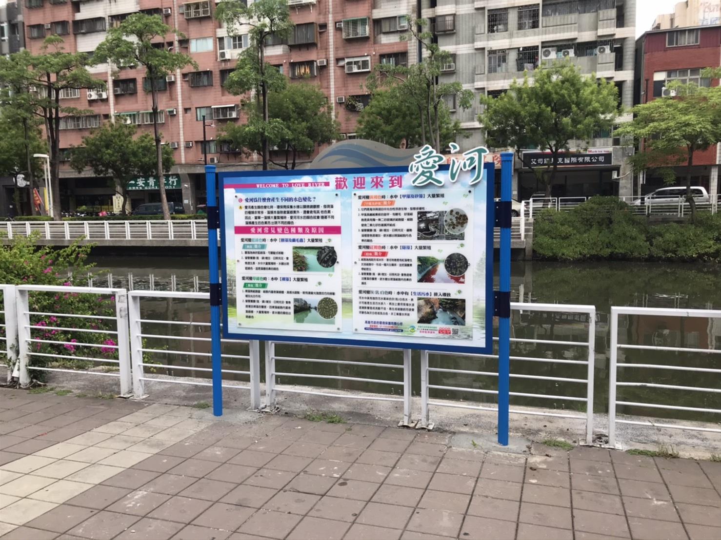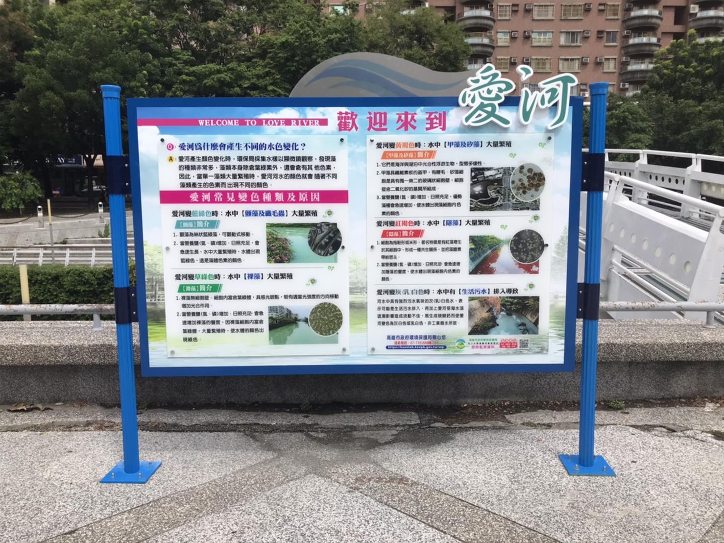 環保局針對愛河水色變化原因,繼108年於愛河左岸河堤公園、愛河之心左側入口及幸福川(玉皇宮前)設置三座解說告示牌後,今(109)年分別於愛河右岸河堤公園、龍華橋旁及幸福川(三鳳宮前)等三處河段新增設置三座解說告示牌,新設解說告示牌版面擴大一倍,解說字體變大且加入環保局河川水質連續自動監測站資訊,方便市民朋友閱覽並可透過手機掃瞄QR code即時掌握愛河中都橋、幸福川及中正橋的水溫、酸鹼度、導電度、鹽度、溶氧等水質資料。