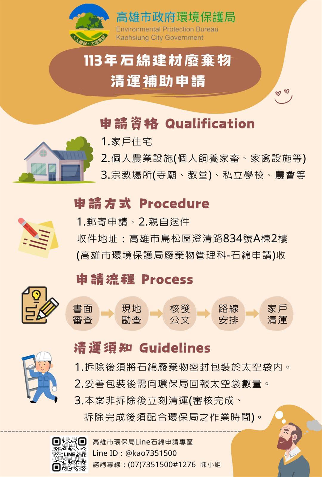 https://reurl.cc/EjWR9R),另欲查詢申請案審查進度或諮詢石綿相關問題,可透過高雄市石綿建材清除處理官方LINE詢問,將有專人1對1回覆問題;若想知道更多石綿相關資訊,請自行參閱環境部化學物質管理署「石綿資訊專區」 (