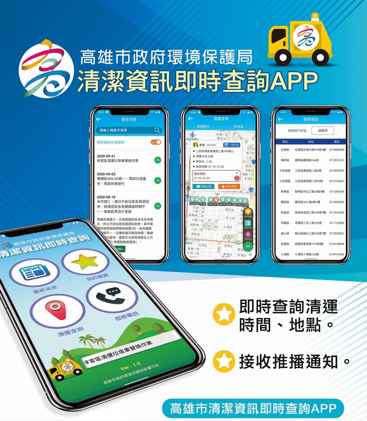 高雄市轄區幅員遼闊,約有近2萬個垃圾清運點,為了使市民能迅速掌握垃圾車清運即時動態,環保局除以響應式網頁技術開發高雄市清潔車「便民查詢系統平台」外,更於今(110)年3月完成「高雄市清潔資訊即時查詢」APP應用程式開發上架,讓市民更方便查詢垃圾車動態資訊。
