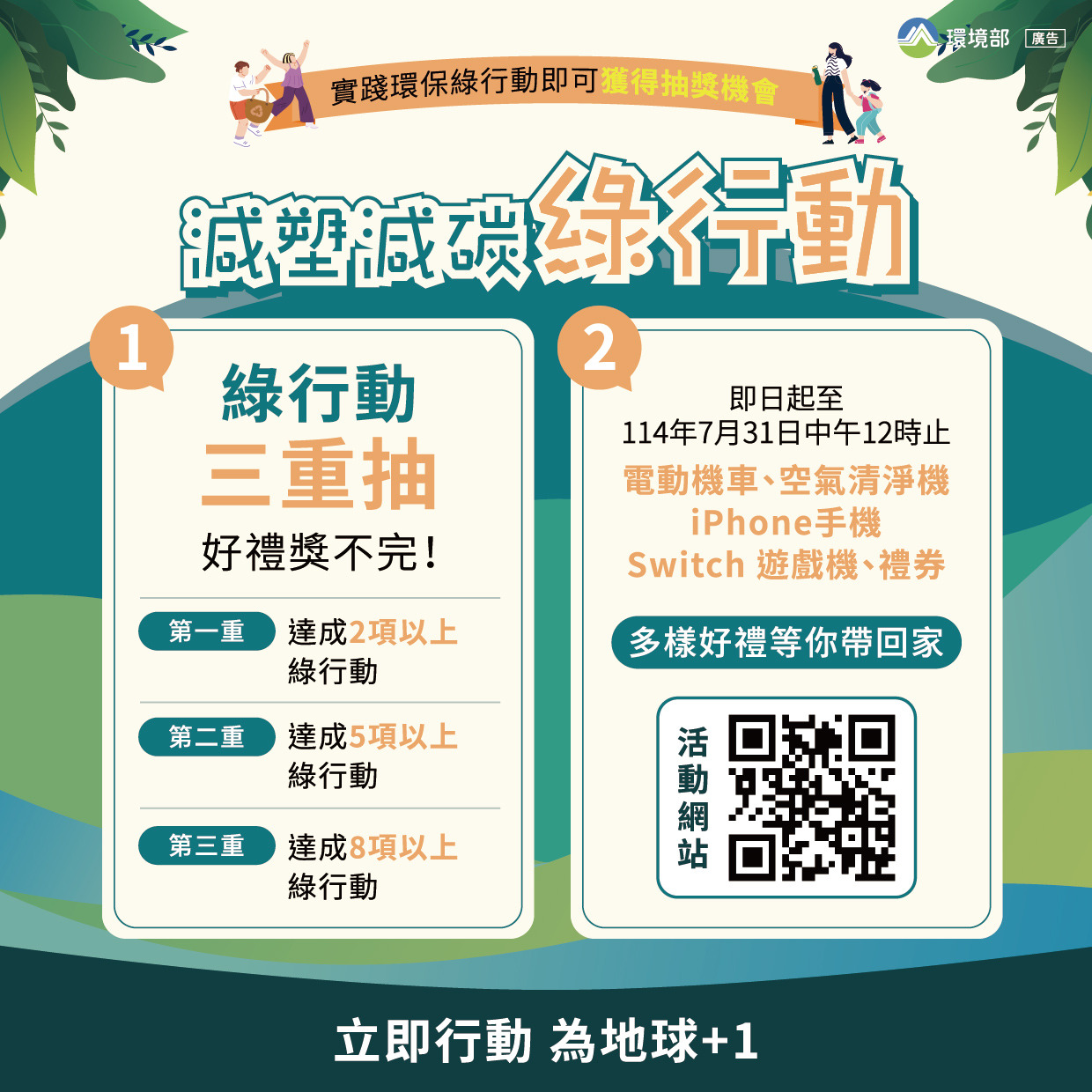 - 本活動自即日起至114年7月31日(星期四)中午12時止,共分為3個階段抽獎鼓勵綠行動,只要在活動期間完成至少2項綠行動任務,並拍照及分享至個人 Facebook 粉絲專頁或 Instagram 帳號,就有機會抽中超值好禮🎁。本次活動共計98個得獎名額,總獎項價值高達新臺幣30萬元,活動詳情可至「減塑減碳綠行動」活動網頁🔎 (https://ecofestival.tw/event.asp)查詢。