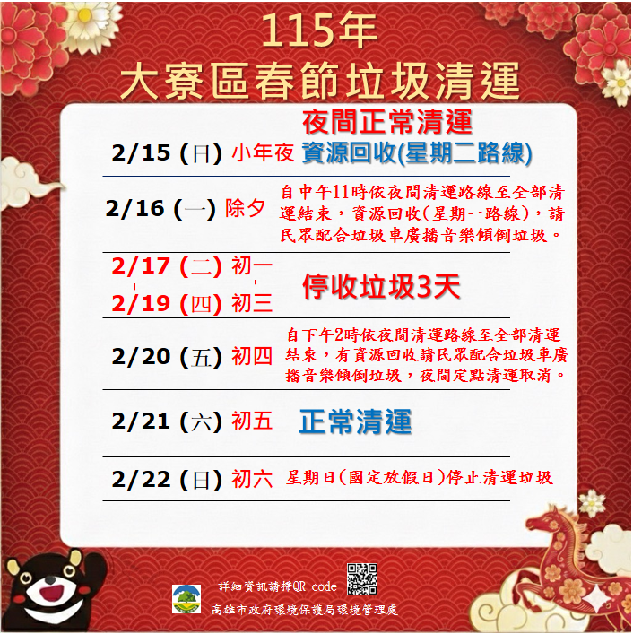 02 月 15 日 (日) 小年夜 正常清運 |