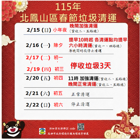 02 月 15 日 (日) 小年夜 正常清運 |