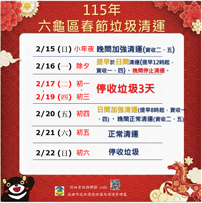 02 月 16 日 (一) 除夕 晚間停止清運 |