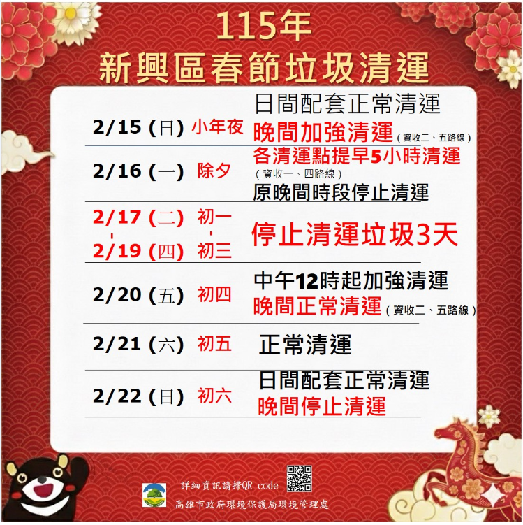 02 月 15 日 (日) 小年夜 加強清運 |