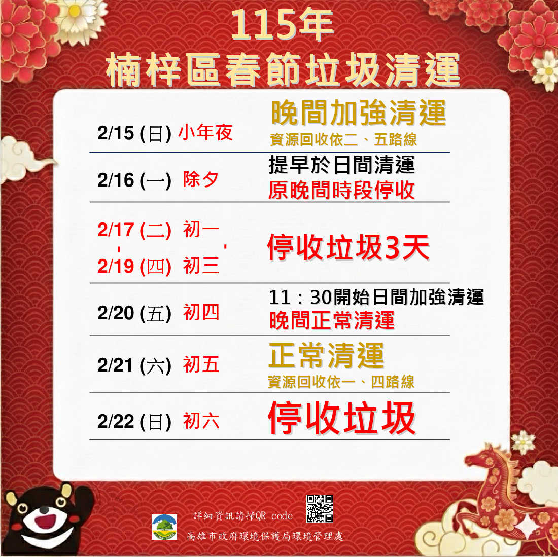 02 月 15 日 (日) 小年夜 加強清運 |