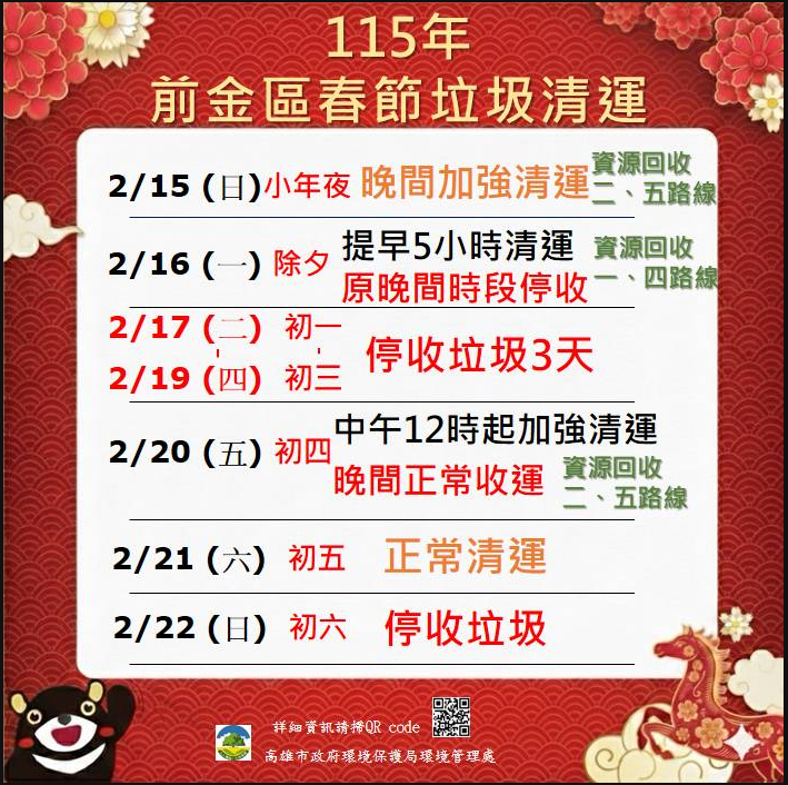 02 月 16 日 (一) 除夕 晚間停止清運 |