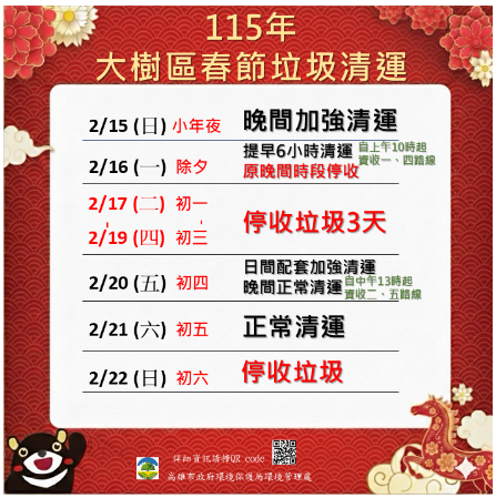 02 月 16 日 (一) 除夕 晚間停止清運 |